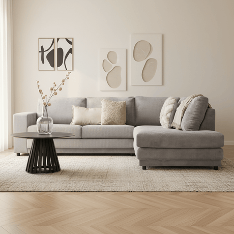12.790,00 krEnhed /Ikke tilgængeligL-formet hjørnesofa i lysegråt ribstof med chaiselong Gabi - højre