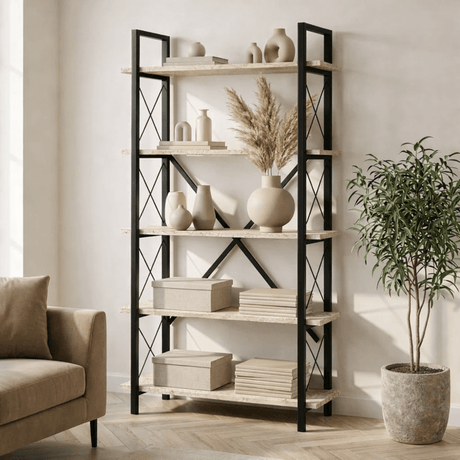 1.536,00 krEnhed /Ikke tilgængeligIndustriel Bogreol Ely Travertin Melamin - Sort Ramme - 180x90 cm