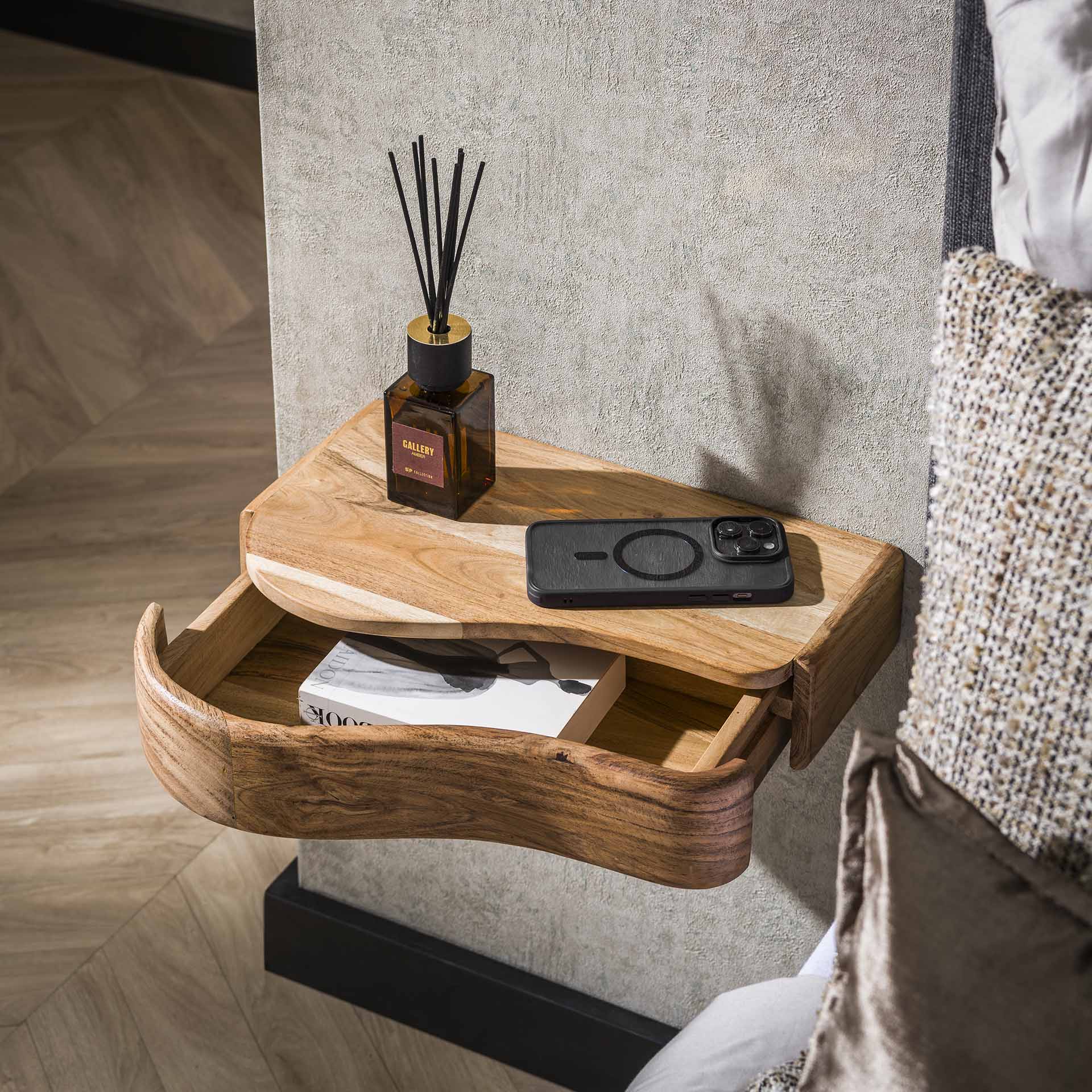 Gør dit soveværelse komplet med Nova væg-natborde, leveret som sæt af 2 i venstre og højre udgave. Disse flydende natborde er lavet af massivt akaciahout med en smuk organisk kant, der fremhæver træets naturlige mønster. Takket være den kompakte størrelse skaber du praktisk opbevaringsplads ved siden af din seng uden at miste gulvplads. Perfekt til moderne, industrielle og skandinaviske indretninger.