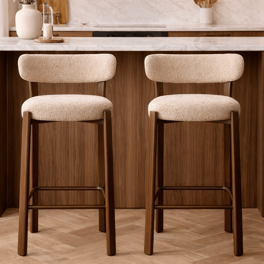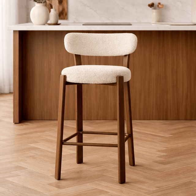 Barstol i bouclé sandfarve Aiko - stel i valnød-look - Japandi