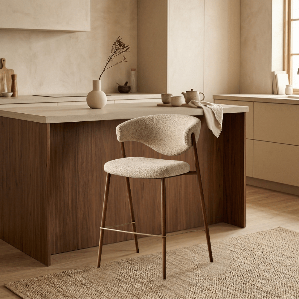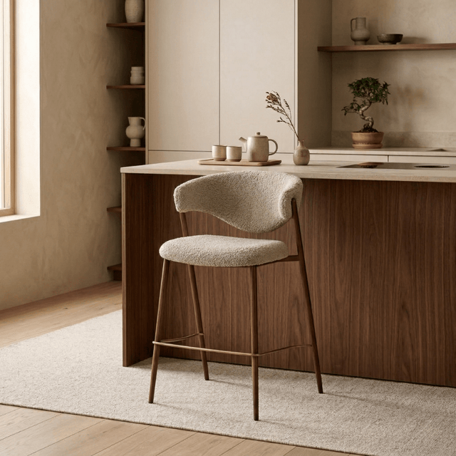 De Kaito barstoel combineert Japandi eenvoud met eigentijds design. De zachte bouclé bekleding in zandkleur en het warme walnootlook frame geven je keuken eiland of bar een serene, natuurlijke uitstraling. De afgeronde vormen en comfortabele, unieke organische rugleuning rugleuning maken van Kaito een perfecte barkruk voor een sfeervolle uitstraling in je interieur.