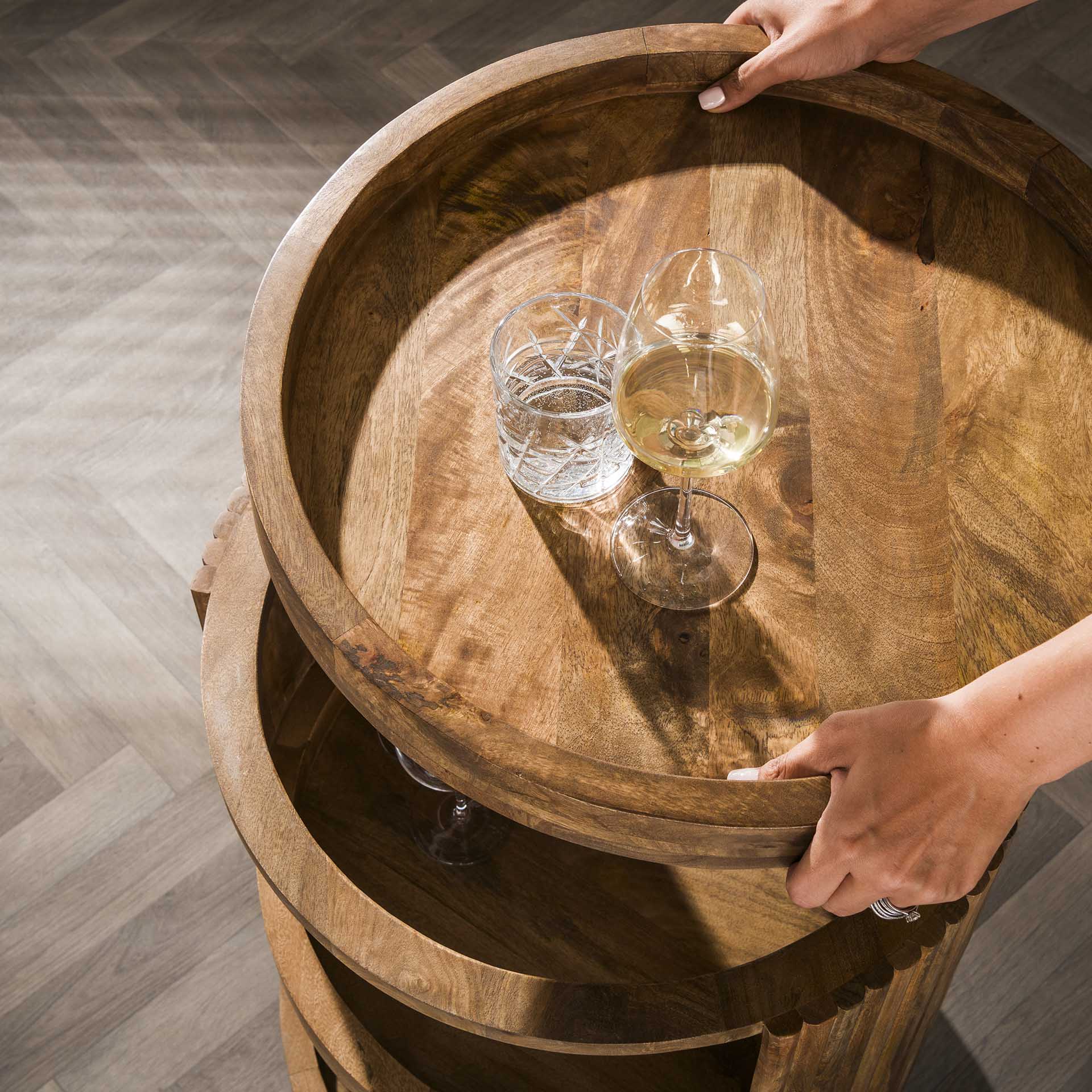 Skab atmosfære og funktionalitet med denne kompakte bartrolley i sandfarvet mangohout. Det massive træ giver et varmt, naturligt udseende, der nemt passer ind i moderne og industrielle interiører. Takket være det gennemtænkte design har du en praktisk hjælper til fester, kaffestunder eller en hyggelig aften derhjemme. Trollyen har plads til glas, flasker og tilbehør, mens du nemt kan flytte den rundt takket være hjulene.