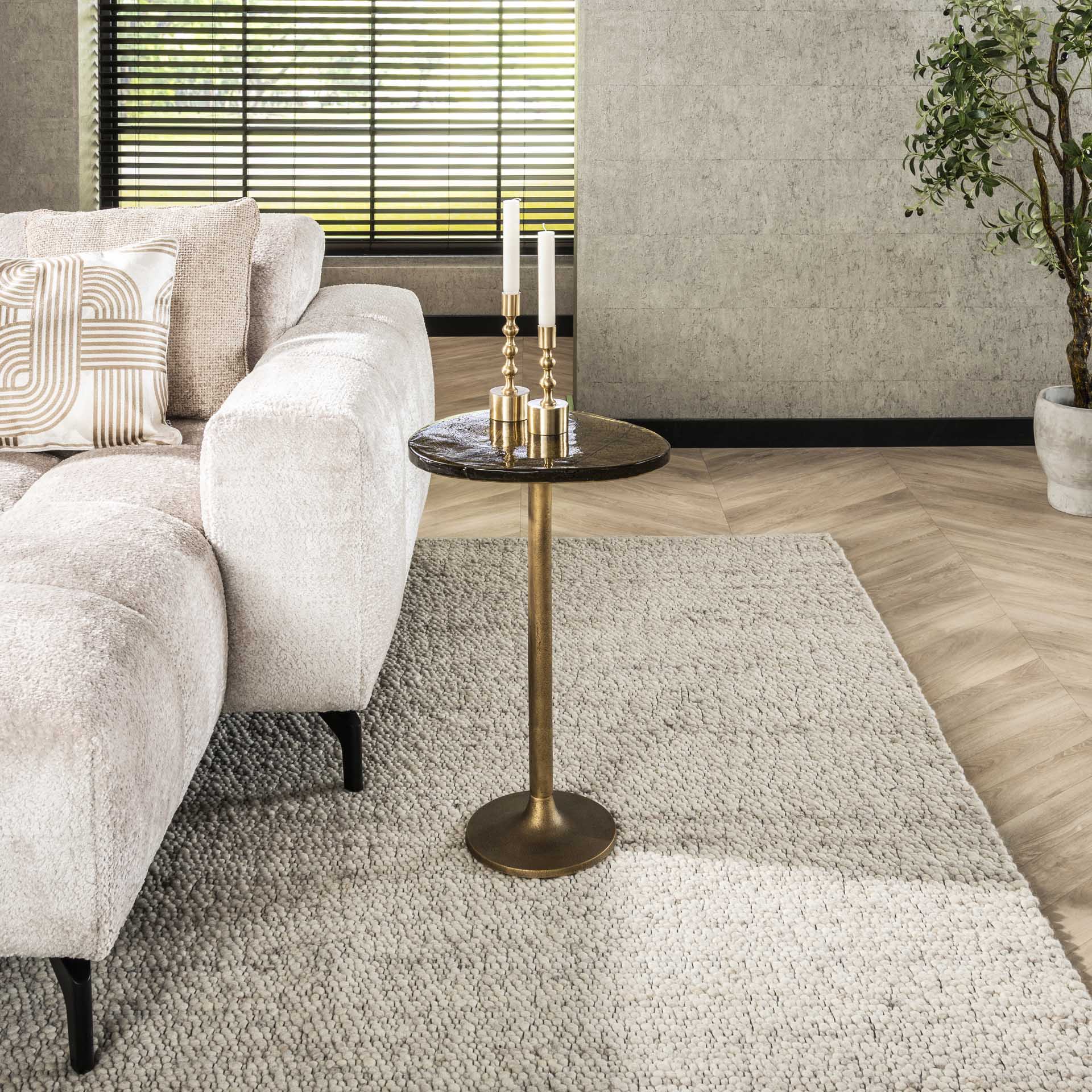 Gør din siddeplads komplet med sidebordet Nola. Den varme antikguld finish giver ethvert interiør et luksuriøst præg, mens den slanke silhuet tager lidt plads. Perfekt ved siden af sofaen, som plantebord eller til at vise dine yndlingsindretningselementer. Takket være den kompakte form kan du nemt skubbe Nola hen hvor der er brug for ekstra stil og funktionalitet.