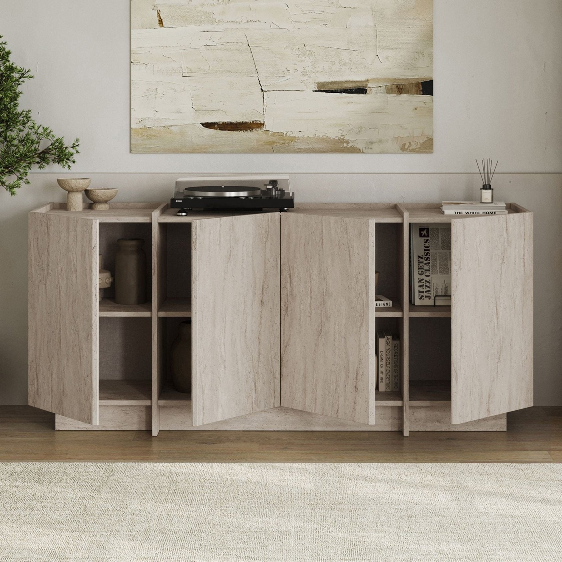 Dit dressoir is vervaardigd uit hoogwaardig travertin look melamine. Dit materiaal biedt de natuurlijke en warme uitstraling van travertin, maar met de voordelen van melamine: het is uiterst krasbestendig, kleurvast en zeer eenvoudig te onderhouden. Een vochtige doek is voldoende om je meubel jarenlang als nieuw te houden.
