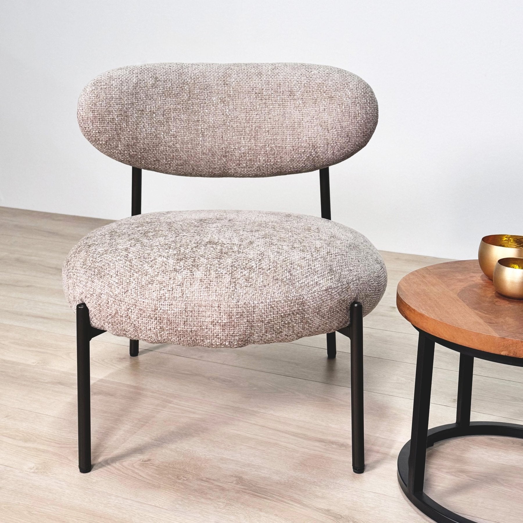 Prøv lænestolen Nova Rund, et stilfuldt blikfang med blød, sandfarvet polstring. Den runde sæde og ryg giver en dejligt komfortabel siddeplads, mens den kompakte størrelse nemt passer i mindre stuer, soveværelser eller læsehjørner. Den neutrale beige nuance kombinerer let med forskellige interiører; fra moderne til skandinavisk. Takket være det holdbare vævede stof er Nova Rund egnet til daglig brug og til alle årstider.