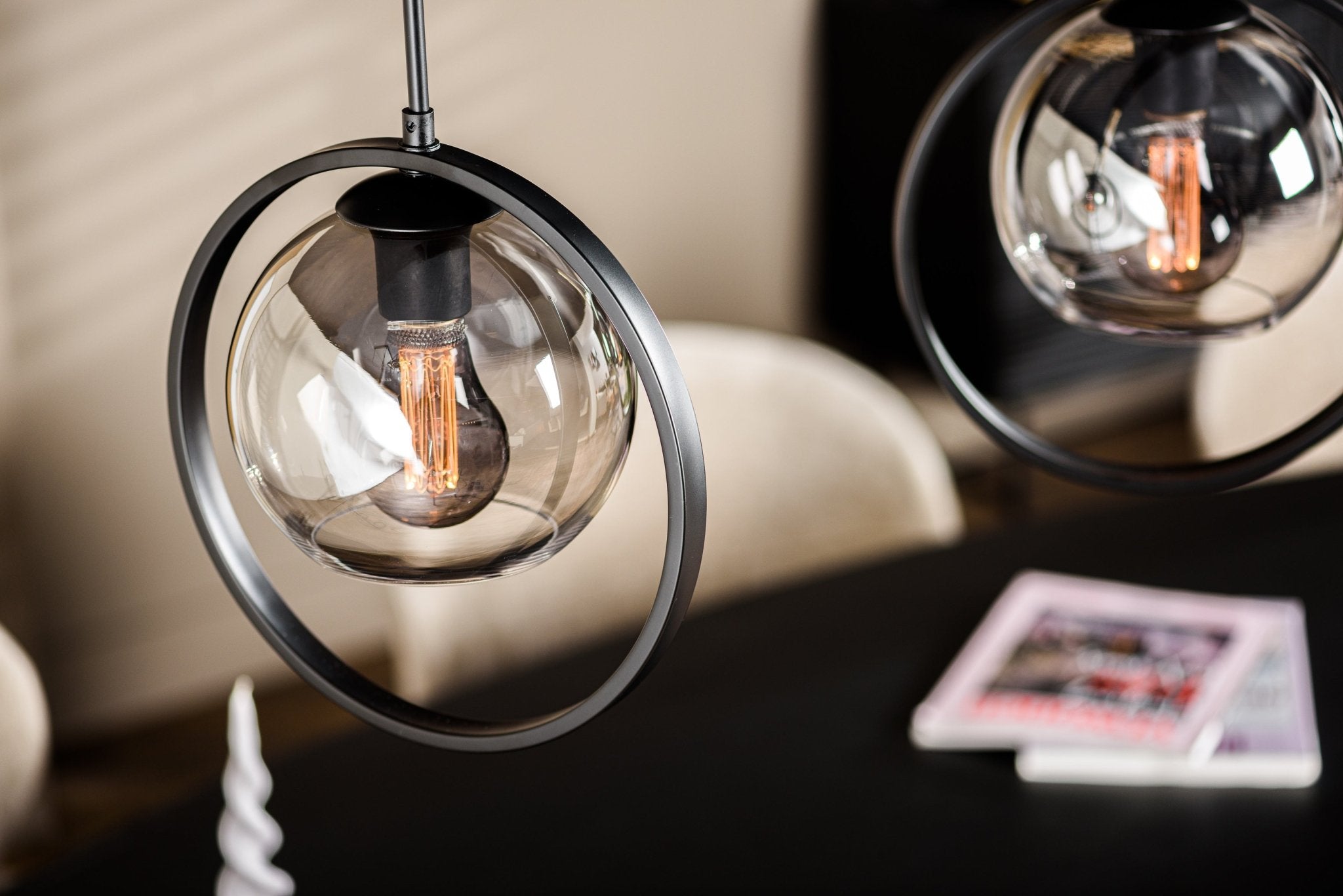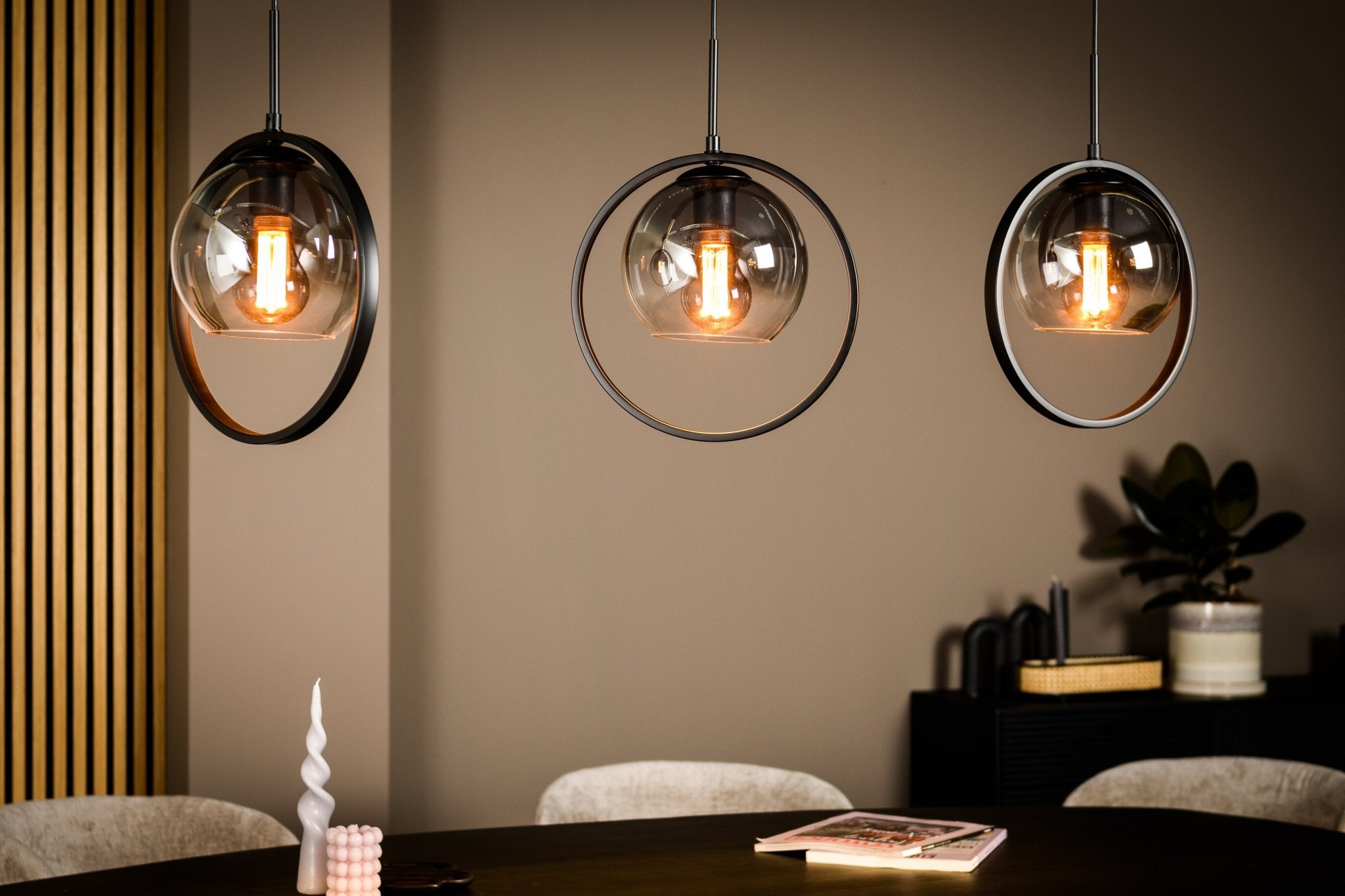 Denne industrielle hængende lampe Elif indeholder tre lyspunkter og er lavet af en rund model. Metalcirklerne kan vende sig fuldstændigt og kan justeres efter ønske. Den hængende lampe er færdig i en mat sort finish i kombination med røgglas og er en rigtig iøjnefaldende i din spisestue eller køkken. Elif -hængende lampe er justerbar op til 165 cm. Takket være røgglasarmaturet distribueres lyset af rummet.