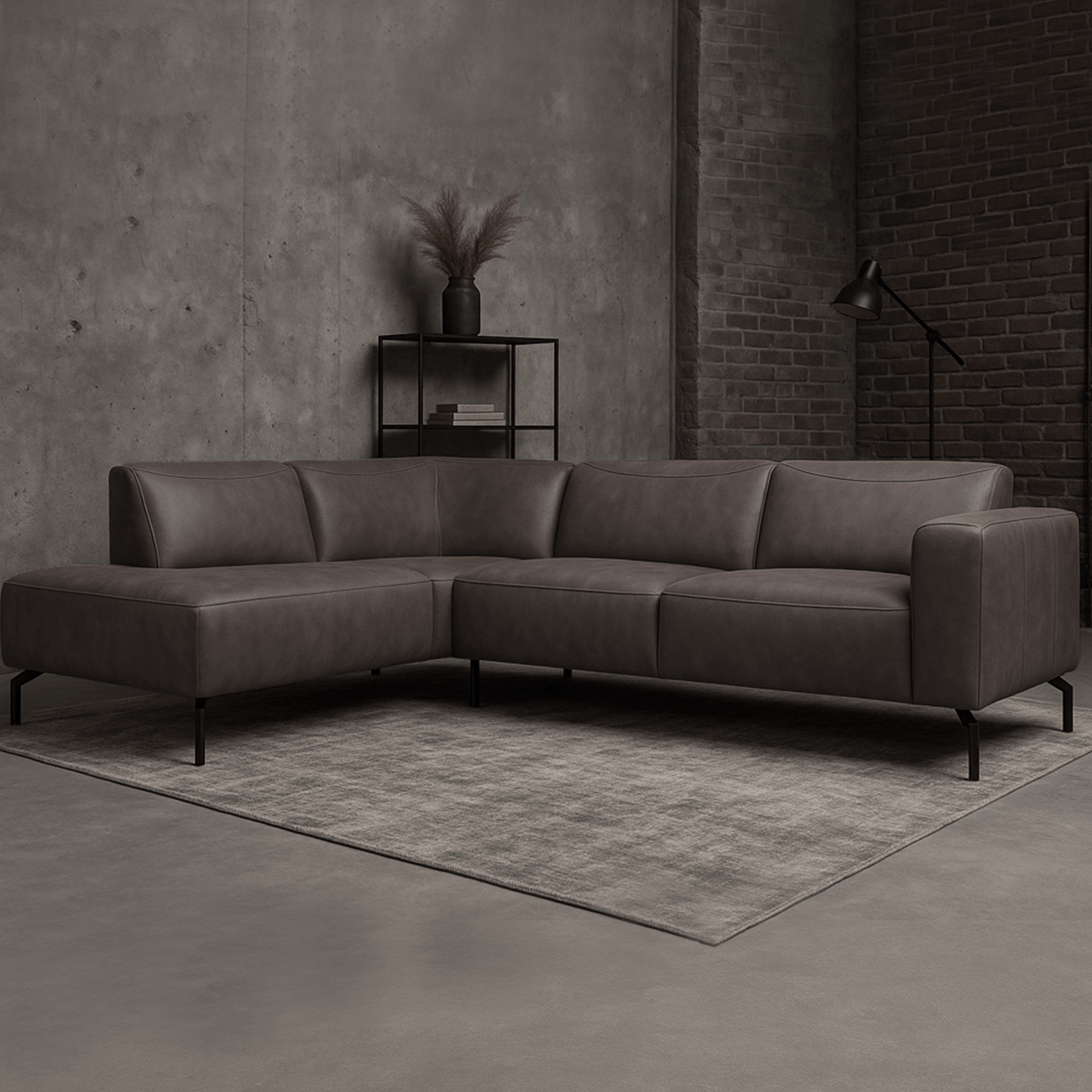 Den moderne hjørnesofa Barin er lavet af et robust eco-læder og har metalben. Denne slidstærke hjørnesofa har en komfortabel siddeplads med sine brede og bløde puder.