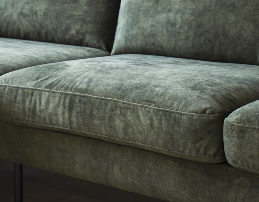 Hjørnesofaen Gaya er betrukket med velour. Velour er en stofart, der stammer fra Asien og kom til Europa omkring 1400. Ved velour væves der små løkker, hvilket skaber et blødt, skinnende stof på toppen.