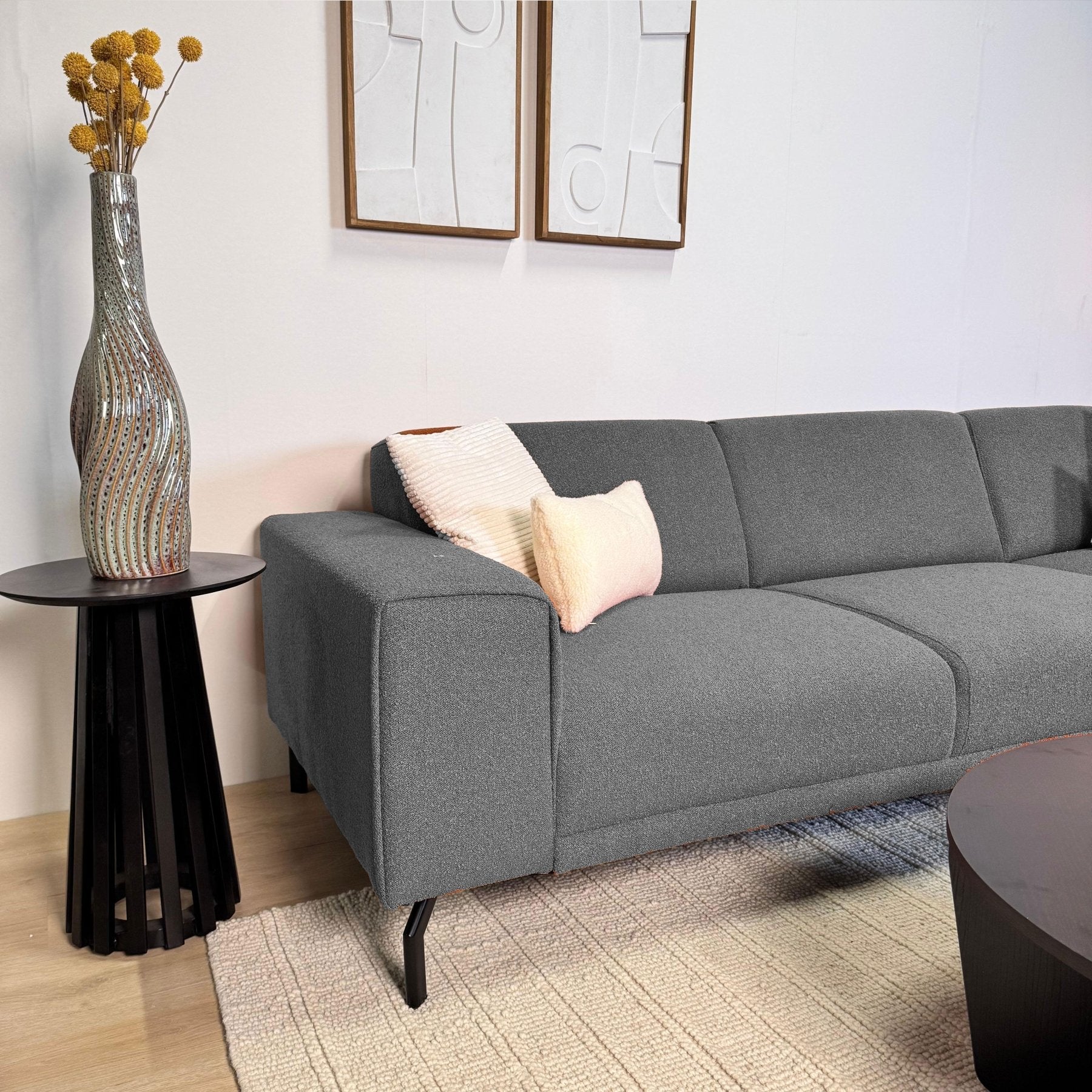 Leder du efter en stor, komfortabel hjørnesofa i bouclé stof? Og vil du have, at din hjørnesofa bliver midtpunktet i din stue? Så er hjørnesofaen Maël i grå farve et fremragende valg!