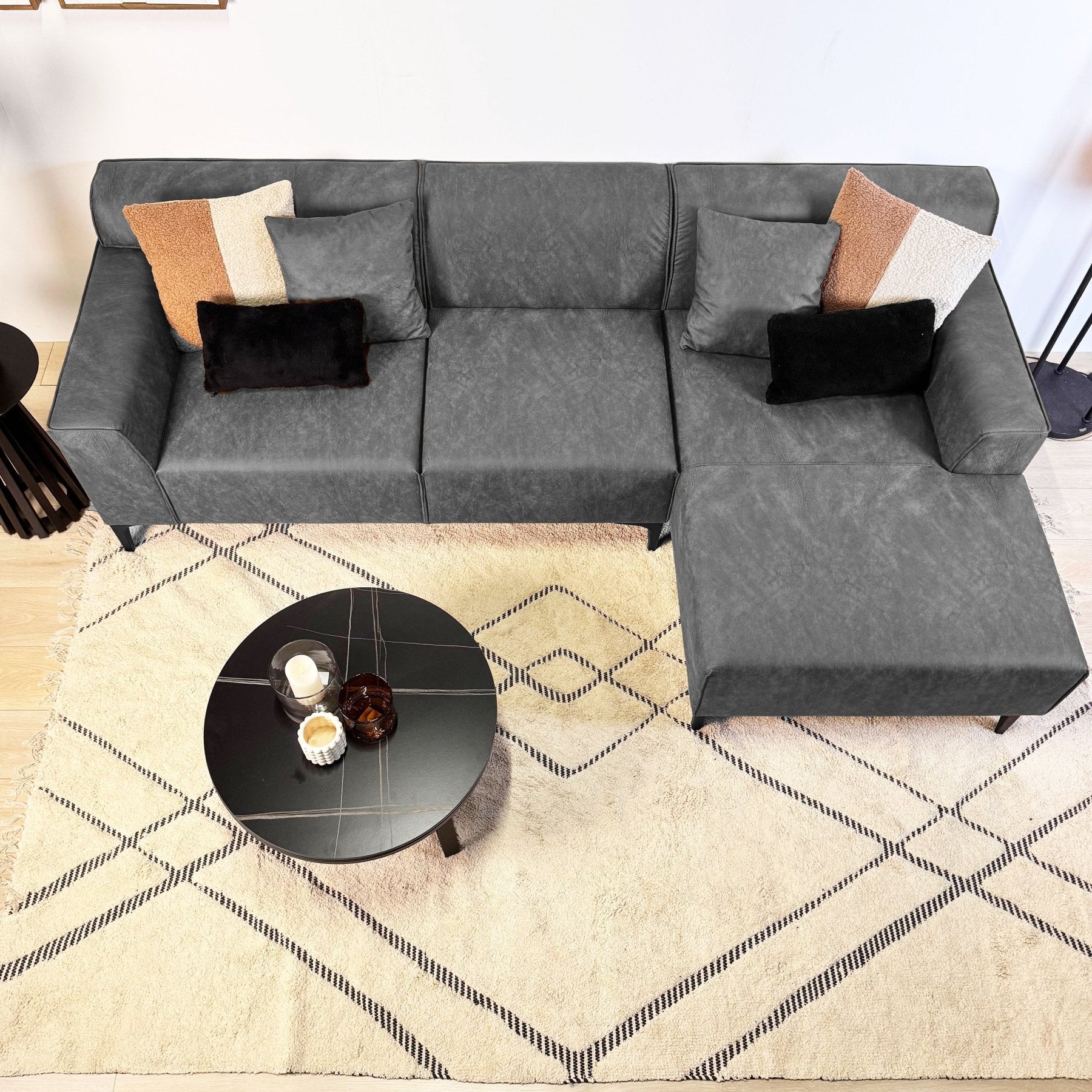 Leder du efter en sej antracitfarvet hjørnesofa med en kort lounge? Så er Davidson den hjørnesofa, du leder efter! Denne farve bringer en moderne atmosfære til enhver stue, mens designet tilbyder en perfekt balance mellem funktionalitet og elegance. Den kompakte hjørnesofa med kort chaiselong er perfekt til mindre stuer.
