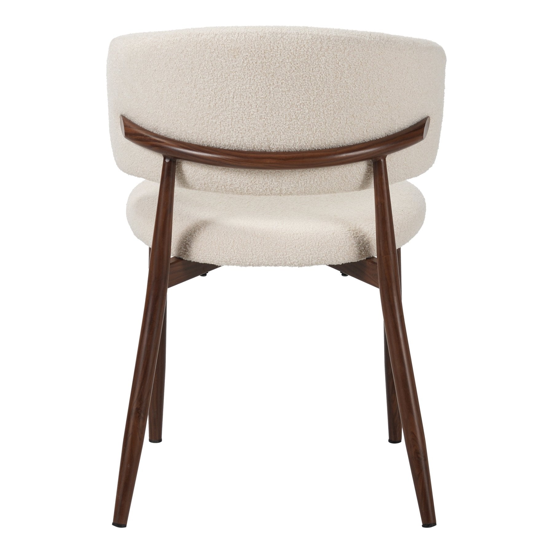 Eetkamerstoel Yuka is een echte eyecatcher voor jouw eethoek! De zachte bouclé stof in beige kleur zorgt voor een warme en stijlvolle uitstraling, terwijl de ronde vormen van de rugleuning de stoel een moderne, speelse look geven. Dankzij de combinatie van een comfortabele zitting en stevige metalen poten met walnoot houtlook past Yuka perfect binnen een Scandinavisch of Japandi interieur.