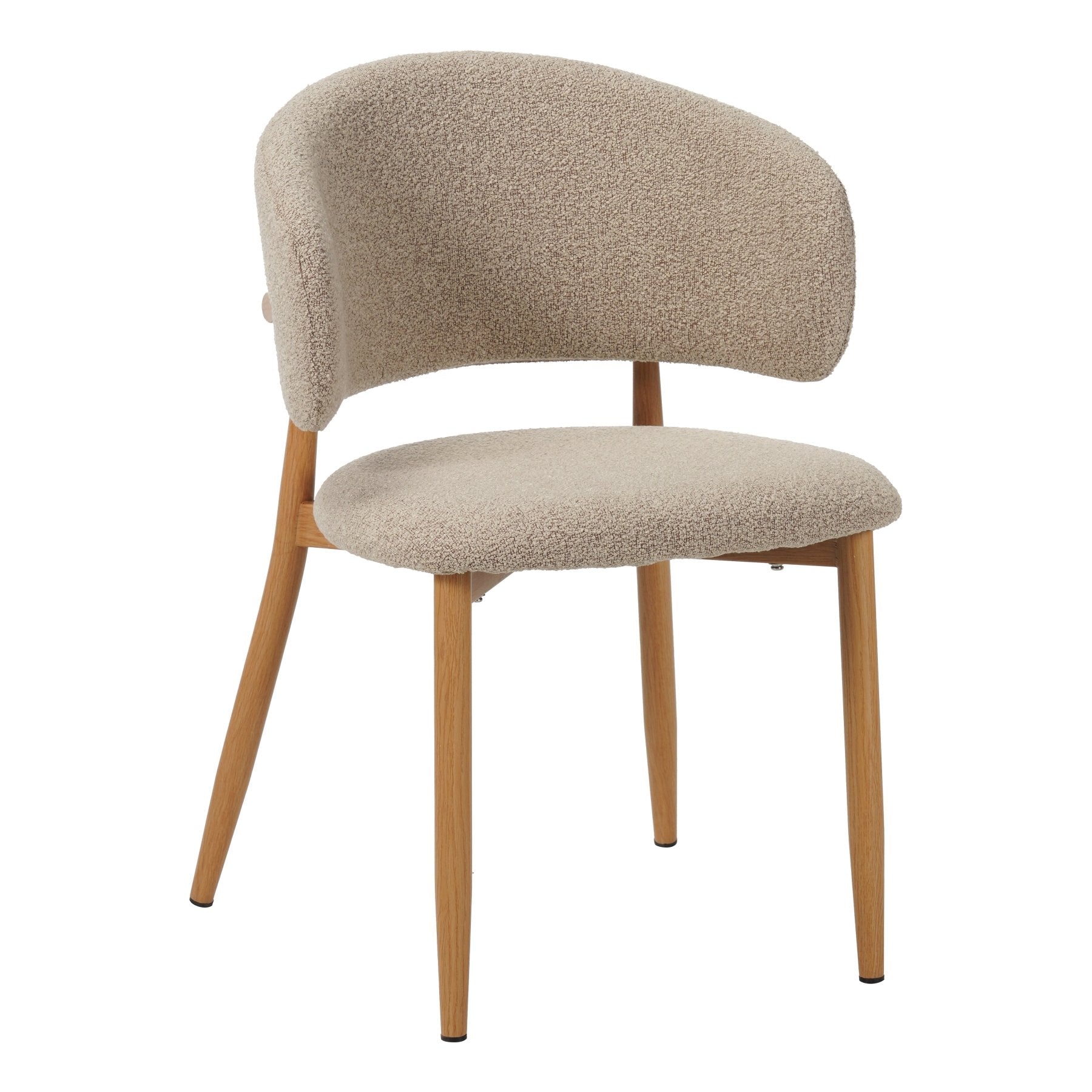 De Yuka stoel biedt heerlijk zitcomfort dankzij de zachte bekleding en afgeronde rugleuning. De metalen poten met houtlook zijn stevig en onderhoudsvriendelijk. Let op: bouclé is een stof met een lusstructuur, waardoor voorzichtig gebruik aangeraden wordt bij huisdieren.