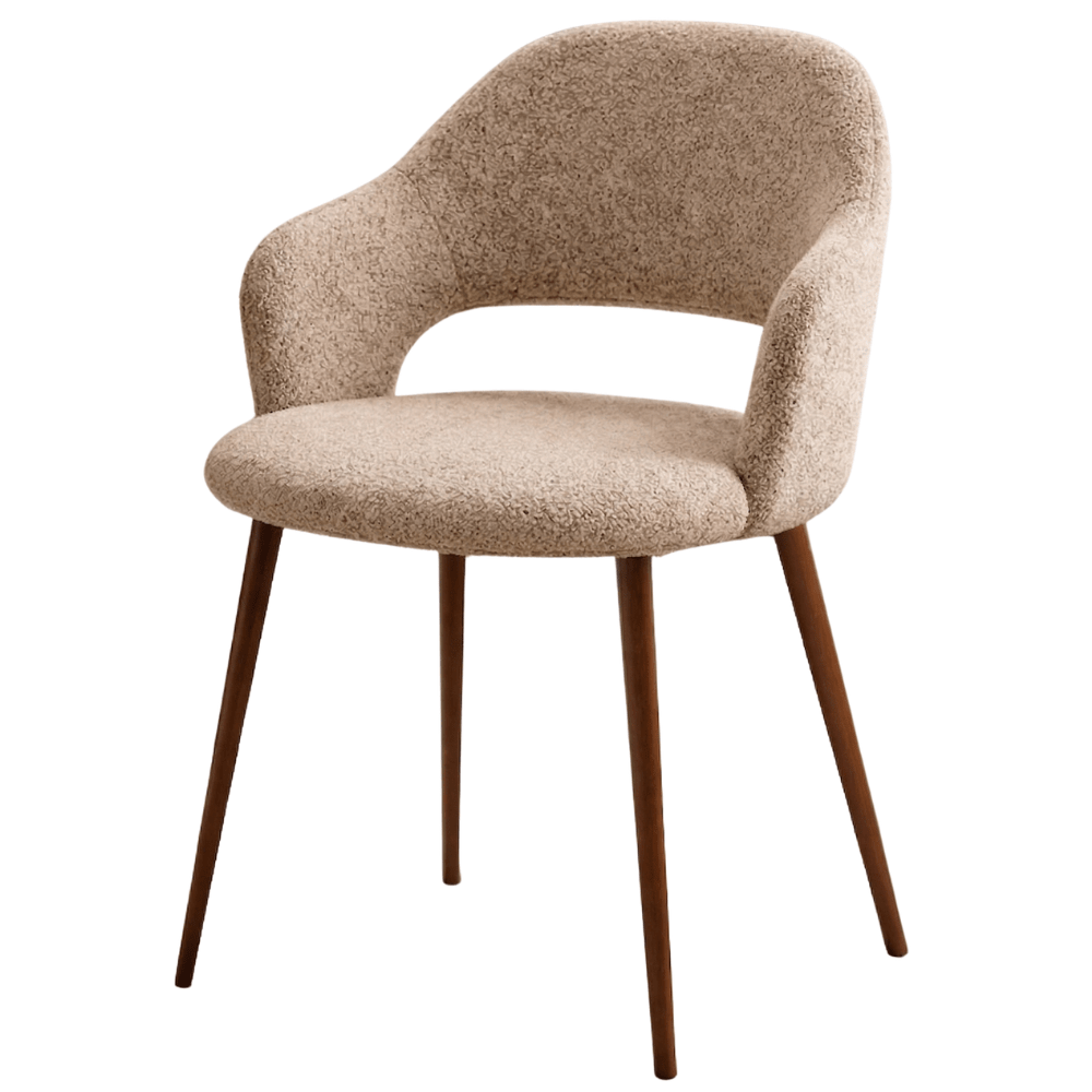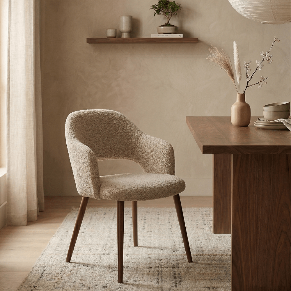 Japandi eetkamerstoel zandkleur bouclé Aki - walnoot frame - met armleuning