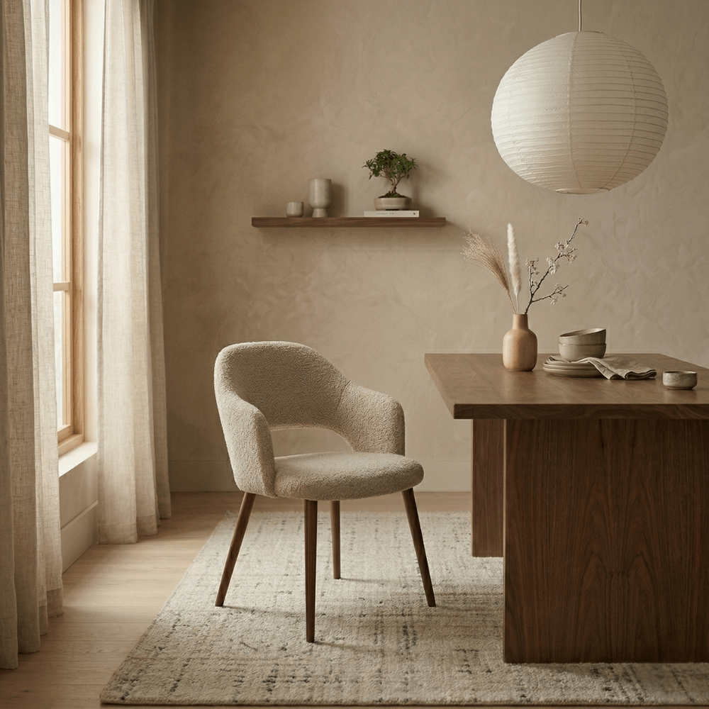 De eetkamerstoel Aki is een stijlvolle toevoeging aan ieder interieur. Dankzij de bouclé bekleding in zandkleur en het warme walnootkleurige metalen frame brengt Aki rust, comfort en elegantie aan jouw eethoek. De ronde vormen en subtiele armleuningen geven de stoel een moderne en zachte uitstraling. Perfect voor wie houdt van een Japandi of Scandinavische woonstijl waarin natuurlijke materialen en eenvoud centraal staan.