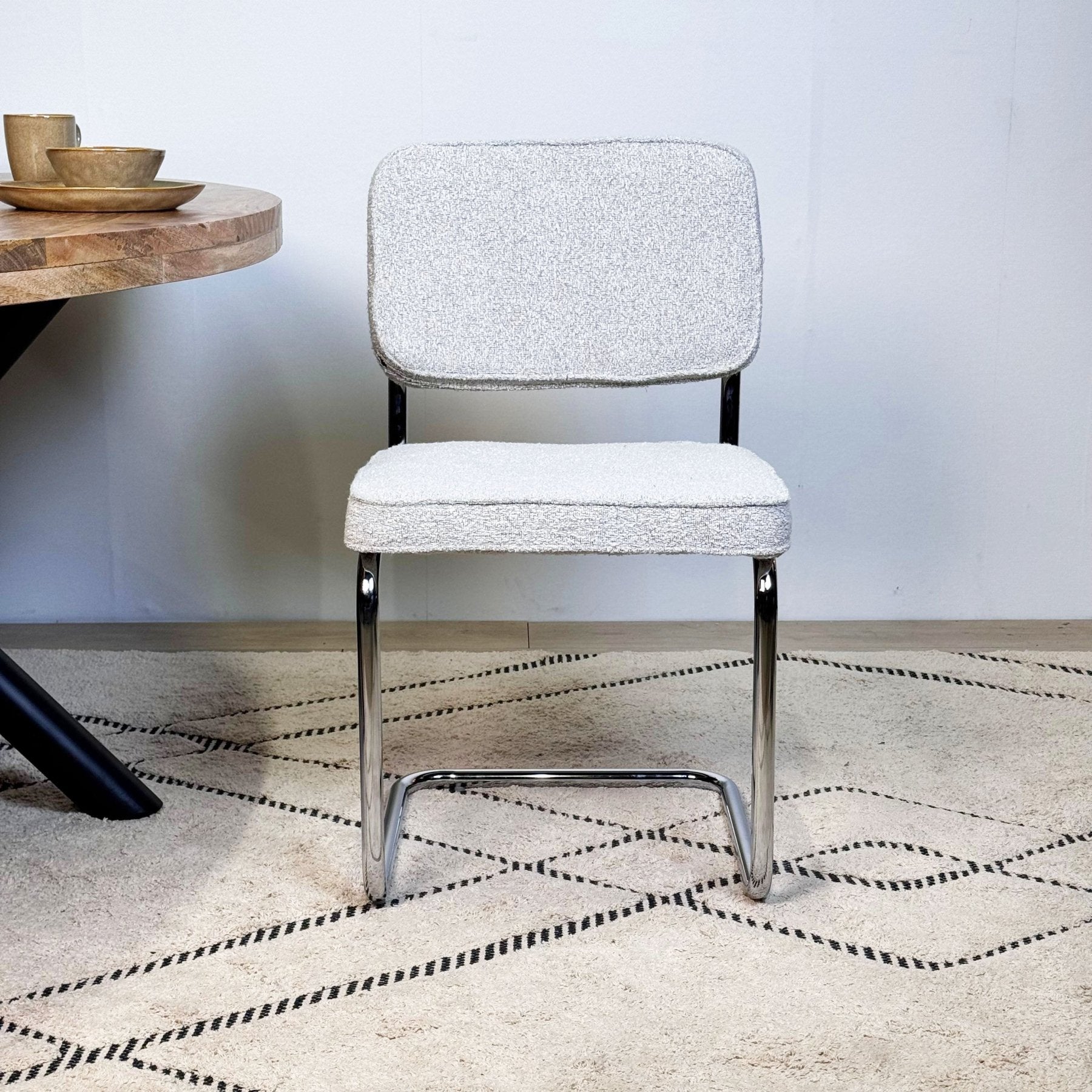 Den Sway Spisestol kombinerer en stilfuld kromramme med et blødt bouclé stof, hvilket giver et moderne udseende i ethvert spisestue eller køkken. Fås i forskellige farver, passer denne moderne spisestol perfekt til forskellige indretningsstile, fra skandinavisk til retro til industrielt.
