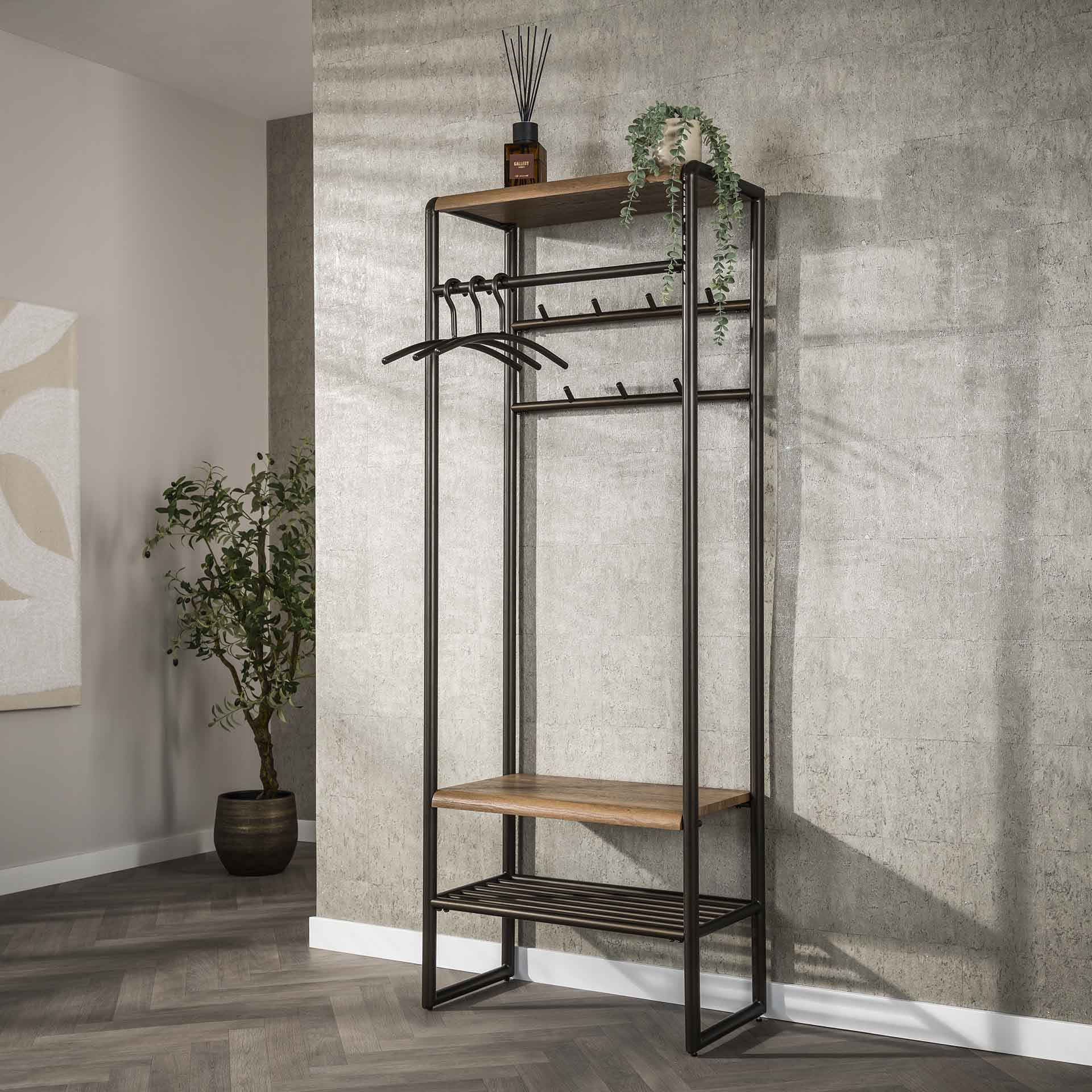 Takket være det slanke design på 70 cm bred og 35 cm dyb tager det lidt plads, mens højden på 185 cm giver flere ophængnings- og opbevaringsmuligheder. Farven drift brown og materialefinishen giver en varm, naturlig stemning, der godt matcher forskellige indretningstyper.